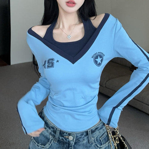 Korean Color Block Fake Two-Piece Long Sleeve Top